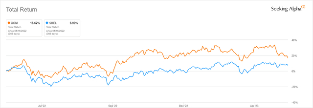 单独看埃克森美孚和SHEL,它们在过去12个月的表现截然不同。