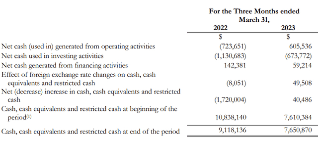 2023 年第一季度,Sea Limited 实现了约 60.6 万美元的经营活动现金流入净额,与上年约 72.4 万美元的现金流出相比有了很大改善。