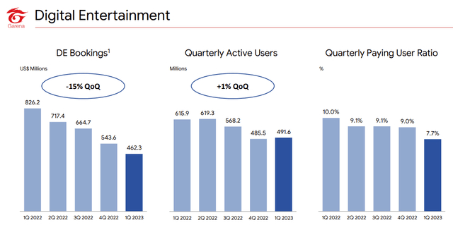 管理层表示,他们看到了 Garena 季度活跃用户群改善的初步迹象,该用户群从上一季度的 4.85 亿连续增长 1% 至第一季度的 4.92 亿。4 月份 Free Fire 也有积极的用户趋势,因为管理层指出 Free Fire 实际上在过去 8 个月期间达到了每月活跃用户的新高峰。