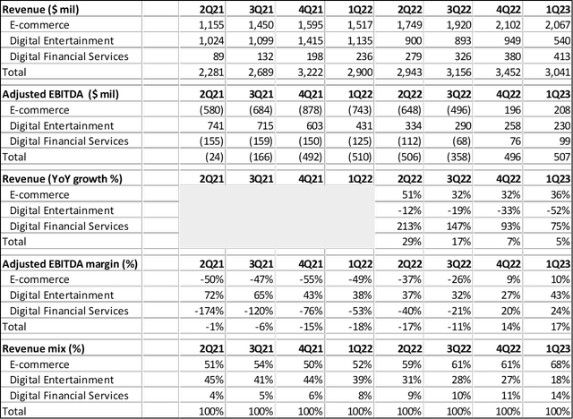 截至 2023 年第 1 季度,电子商务收入增长加速至 36%,而调整后的 EBITDA 利润率从去年的 -49% 提高至 23 年第 1 季度的 10%。这意味着 Sea Limited 的电子商务部门可以继续增长,尽管它专注于盈利能力。