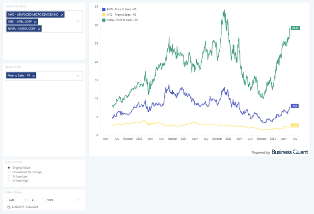 英伟达的股价是该公司过去 12 个月销售额的 28 倍以上,这在独立基础上是非常高的。下图显示倍数接近多年高点,也远高于该芯片制造商最接近的竞争对手AMD和英特尔公司。