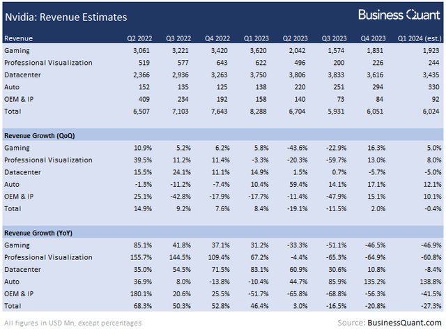 全球多家企业已开始削减与数据中心相关的资本支出(如此处),以便在这些充满挑战的宏观经济条件下实现财务节俭。由于客户削减支出,亚马逊、微软和谷歌的云平台增长放缓。因此,估计对英伟达数据中心 GPU 的需求将会疲软,该部门第一季度的收入将下降 5% 至 34 亿美元。