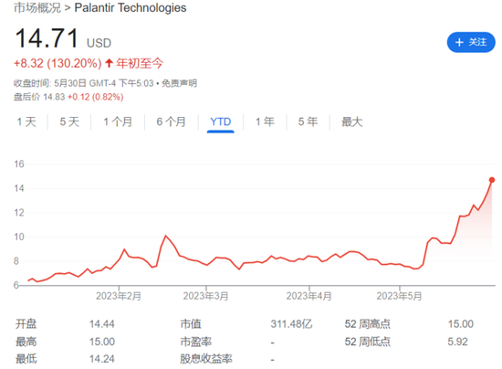 今年以来,C3.ai股价已经大幅上涨近300%;Palantir今年以来涨幅也已经达到130%。