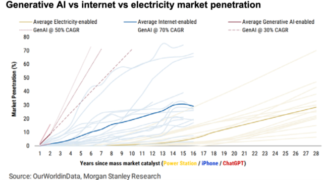据此,摩根士丹利认为,人工智能技术的扩散速度已经超出了此前的任何一种划时代技术,这意味着更多的投资机会,也意味着更多的问题。