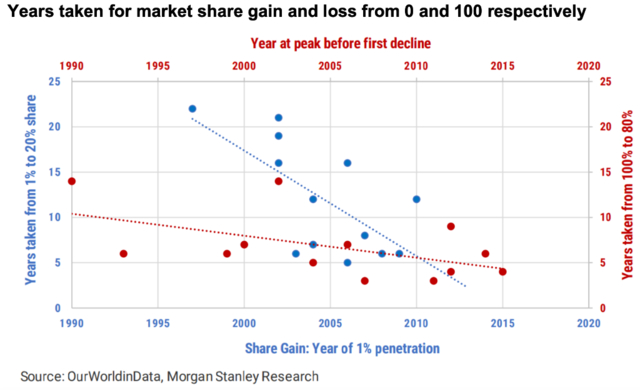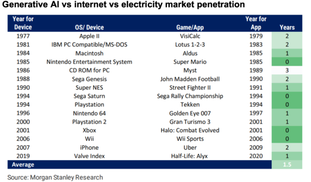 从50多个 “平台+应用 ”的创新中,摩根士丹利得出结论,“杀手级应用”往往需要1.6年左右的时间才能从新的颠覆性技术平台中出现: