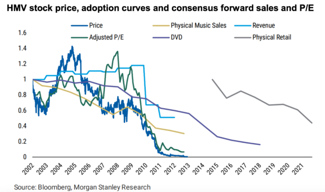 如曾经的留声机生产厂商HMV,在其股价下跌7年后,其利润才出现显著下滑。