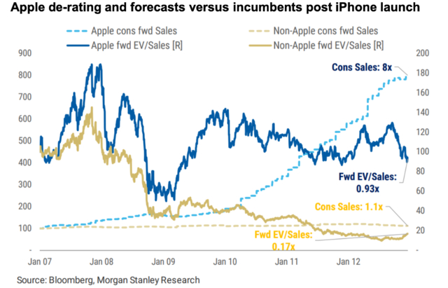 苹果和老牌公司之间真正的分歧发生在接下来的5年里,苹果的估值回落到低于iPhone发布时的水平,但普遍的销售预测高出8倍。