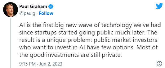 新浪科技讯 北京时间6月5日早间消息,美国著名创业孵化器Y Combinator联合创始人、风投家保罗·格雷厄姆(Paul Graham)最近公开表示,公共市场投资者缺少渠道参与AI浪潮,因为几乎所有的优秀AI公司都是私营企业。