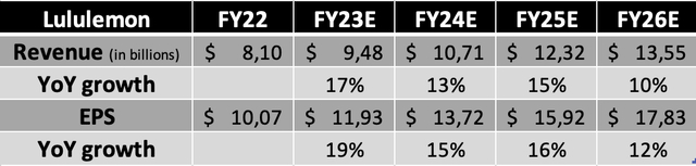 简短地解释一下这些估计,现在预计 Lululemon 报告的 23 财年收入为 94.8 亿美元,每股收益为 11.93 美元,均处于管理层指导的高端。预计 Lululemon 将在下半年报告好于预期的业绩,这主要是受需求略有改善和国际市场持续增长的推动,而国际市场主要受在华市场增长的推动。