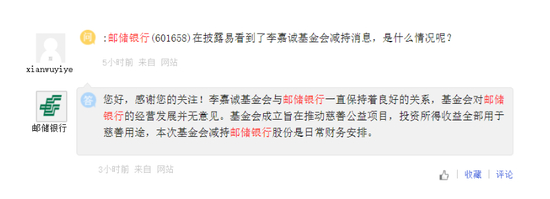 5月12日,邮储银行在互动平台回应遭李嘉诚基金会减持一事,称李嘉诚基金会与邮储银行一直保持着良好的关系,基金会对邮储银行的经营发展并无意见。基金会成立旨在推动慈善公益项目,投资所得收益全部用于慈善用途,本次基金会减持邮储银行股份是日常财务安排。