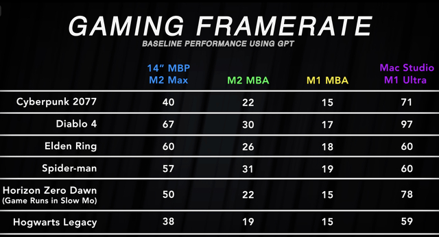 M2 Max 和 M1 Ultra 在两层仿真下似乎可以很好地玩 DirectX 12 游戏。以下是一位测试人员在不同 Mac 上的一些帧率: