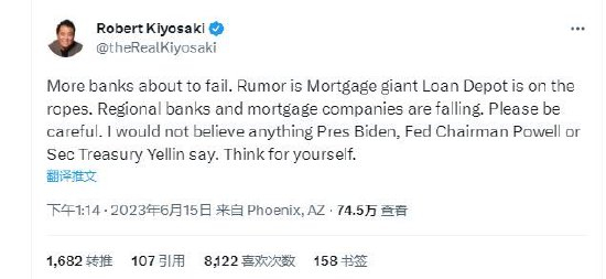 他写道:“更多银行即将倒闭。有传言说抵押贷款巨头Loan Depot即将破产。地区性银行和抵押贷款公司正在坠落。请小心。我不会相信拜登总统、美联储主席鲍威尔或财政部长耶伦所说的任何话。要独立思考。”