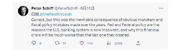 华尔街资深投资者彼得·希夫(Peter Schiff)对清崎的推文进行了回应,称“美联储和联邦政策是美国银行体系现在资不抵债的原因。”