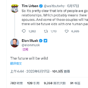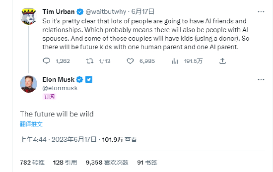 这位科技亿万富翁周六在推特上回应了一名用户的评论,该评论揭示了人工智能成为人类关系甚至家庭不可或缺的一部分的可能性。