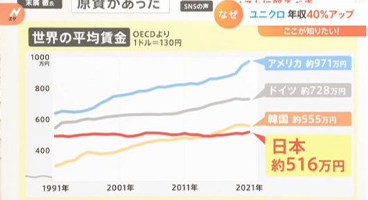 日本平均工资近为经合组织平均水平(约51000美元)的四分之三。