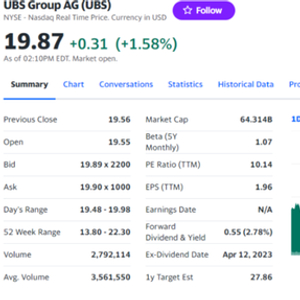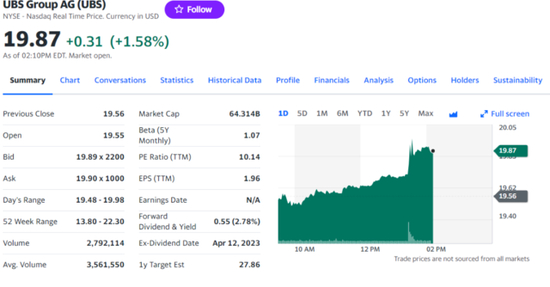 消息发布后,瑞银美股一度涨约2%。