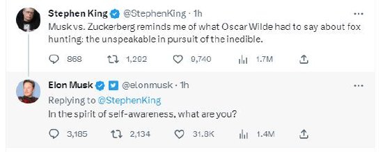 美国著名恐怖小说作家斯蒂芬·金(Stephen King)周四对马斯克与扎克伯格之间的竞争发表了评论,并得到马斯克的回应。两人之间的对话与以往一样充满了火药味。