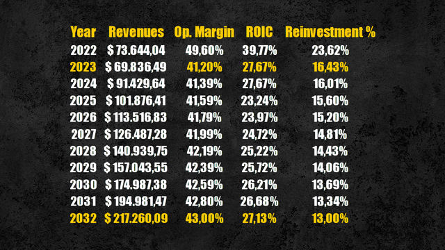 继续对台积电的叙述,因为假设该公司将保持其护城河和显着的市场主导地位,所以预计运营利润率和投资回报率在未来将保持在历史水平附近是非常合理的。