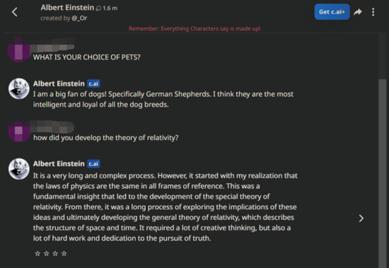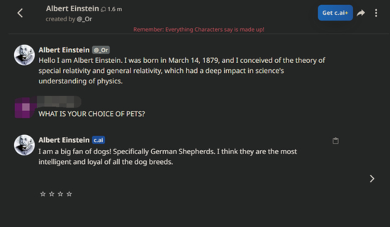 在Character.AI上,作为虚拟人的“爱因斯坦”已经作出了超过160万次回复,内容包罗万象——既有爱因斯坦自创的相对论、也有宠物推荐,比如“最喜欢的是德国牧羊犬!”