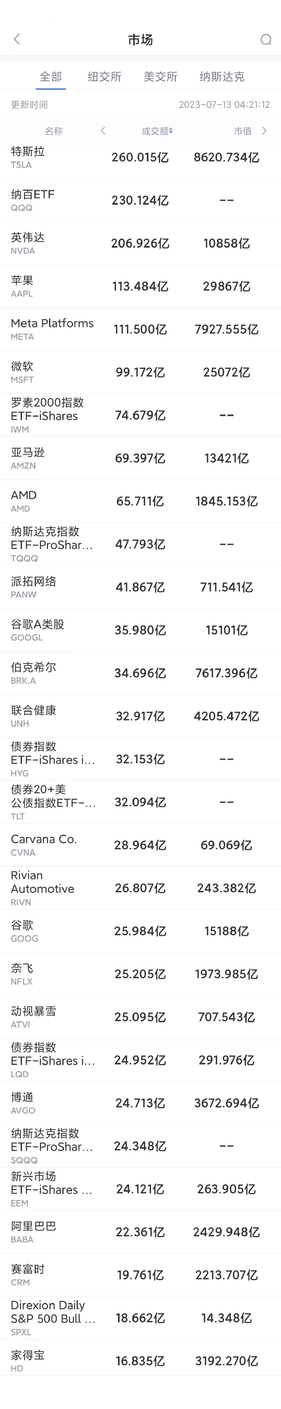 7月12日美股成交额前20:马斯克成立人工智能公司xAI