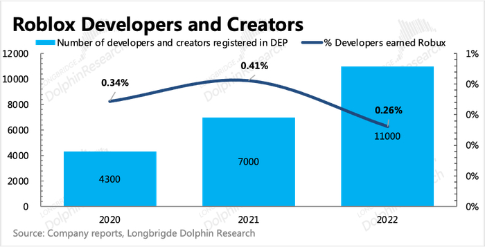 截至2022年底,Roblox平台内获得过Robux进账的创作者有420万人,相比2021年的170万增长了150%,但够资格申请注册DEP的只有1.1万人,同比仅增长57%。