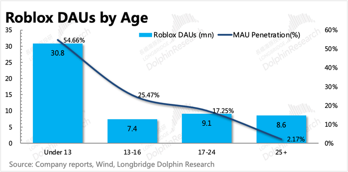 按照2019年的用户年龄分布——13岁以下用户占比57.6%,也就是超3000万名小学生儿童每月登陆一次Roblox,在当地的渗透率达到55%。在其他年龄段,Roblox也有不同的渗透率。