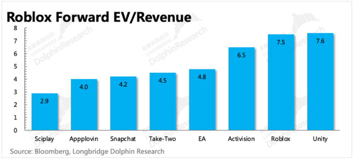 但目前Roblox的估值,对应2024年收入7.5倍PS,与同行比仍算夸张。那么市场究竟打入了多少增长预期和YY的新故事?