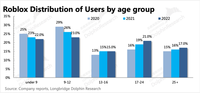 虽然在疫情期间,Roblox上13岁以上的用户规模以更快的速度增长。截止最新2023一季度报情况,Roblox日活用户中,13岁以上用户占比达到了56%,相比疫情前提升了16pct。但并没有提供更细分的年龄分布情况,而管理层每次业绩电话会中的讨论年龄范围,最高也只是围绕在17-25岁区间。