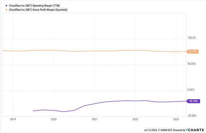 Cloudflare已将长期运营利润率目标设定为20%,但由于其在新产品开发方面的大量投资,我预计未来五年内不会达到这一水平。其固定的网络投资和充足的产能为毛利率和营业利润率的增长铺平了道路,专注于开发和推出新产品表明其在销售和研发方面的投资可能会保持高位。