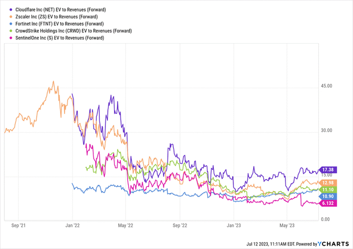 自2022年初以来,Cloudflare的EV/Sales倍数大幅下降,原因是下调了收入指导,这反映了自2018年以来的首次增长减速。尽管如此,该倍数仍明显高于一篮子同行的平均水平。Cloudflare的估值在同类公司中最高,其领先地位可能与其在经济放缓时保持相对强劲增长的能力有关。