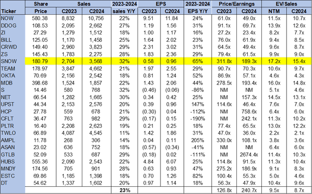 Snowflake的交易价格远高于同行平均水平,且倍数溢价。按市盈率计算,该股的 C2024 年每股收益为 189.3 倍,每股收益为 0.96 美元,而同行平均水平为 240.7 倍。该股的交易价格为 15.4 倍 EV/C2024 销售额,而同行平均水平为 8.7 倍。Snowflake 是一只成长型股票,尽管估值较高,但仍建议投资者寻找有利的切入点。