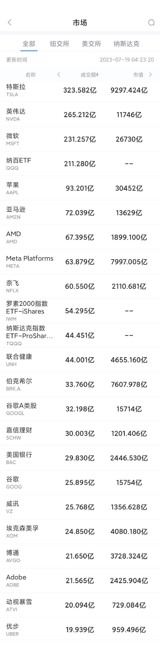 7月18日美股成交额前20:英伟达与微软均创历史新高