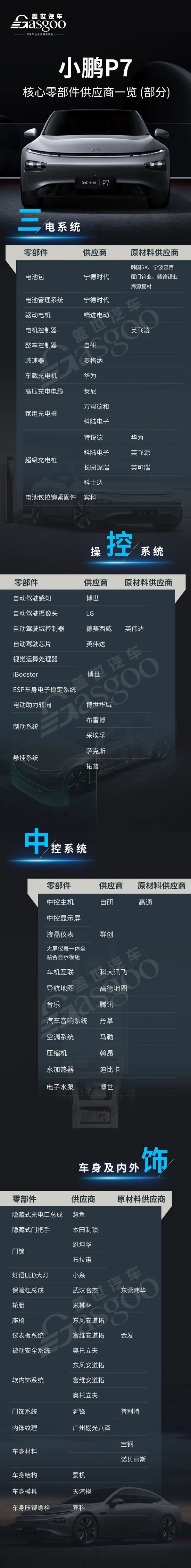小鹏P7核心零部件配套供应商一览