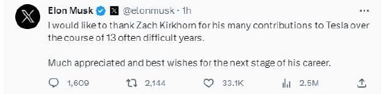 马斯克在旗下社交平台X上发帖称:“我要感谢扎克·柯克霍在特斯拉艰难的13年中做出的诸多贡献。非常感谢并祝福他的下一阶段的职业生涯。”