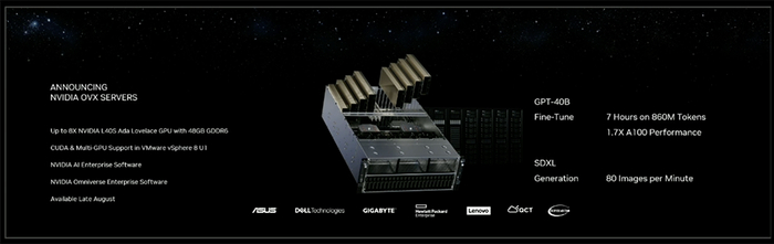 面向数据中心,黄仁勋宣布推出配备全新NVIDIA L40S GPU的NVIDIA OVX服务器,可用于加速AI训练和推理、3D设计和可视化、视频处理和工业数字化等复杂的计算密集型应用。