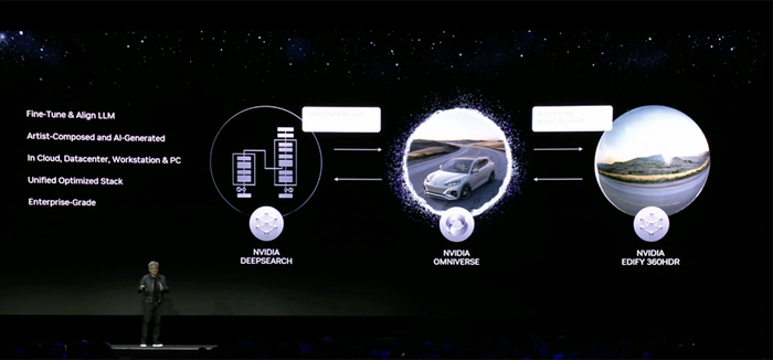 面向元宇宙领域,NVIDIA的主角当仁不让是Omniverse平台,以及该平台的基础——开源通用场景描述框架OpenUSD。生成式AI与Omniverse的结合也此次演讲的重头戏。