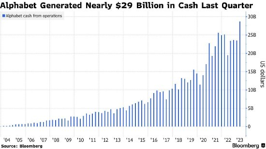 在经历了裁员数千人,并努力遏制其“登月项目”的亏损后,Alphabet在今年第二季度创造了近290亿美元的现金。这使得公司的现金和短期有价证券达到约1180亿美元,超过了纳斯达克100指数中除苹果公司以外的任何一家公司。