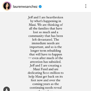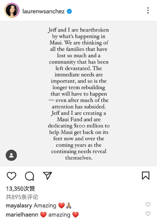 亚马逊创始人贝索斯的未婚妻Lauren Sanchez在社交平台表示,他们将捐赠1亿美元用于夏威夷毛伊岛的灾后重建。