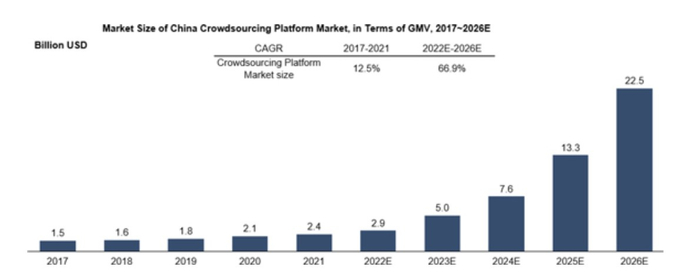 就行业而言,由于众包是实现共享经济的一种在线方式,是实现共享经济的重要途径,因此在互联网技术发展以及市场需求的持续推动下,共享经济相关行业的整体规模仍将成增长趋势。据弗若斯特沙利文数据显示,2021年时,我国共享经济的市场规模为5597亿美元,其预计至2026年时,该市场的规模将达到6460亿美元,年复合增速3.3%。
