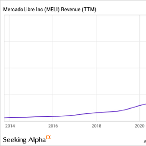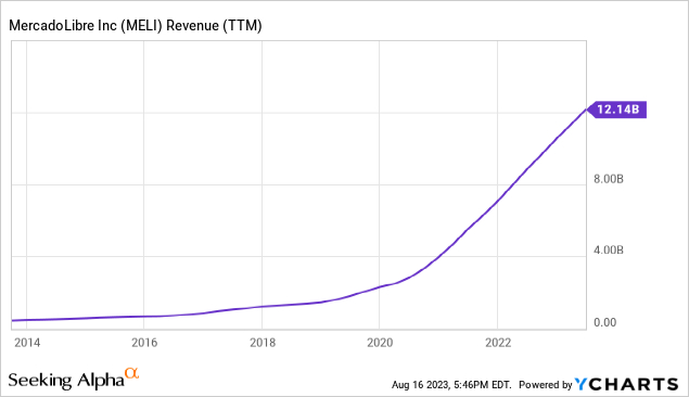 提供的无数服务,加上其快速增长,推动MercadoLibre的收入猛增,就像曲棍球杆的急剧倾斜一样。上面显示的该公司 10 年收入图表证明了其蓬勃发展的轨迹。