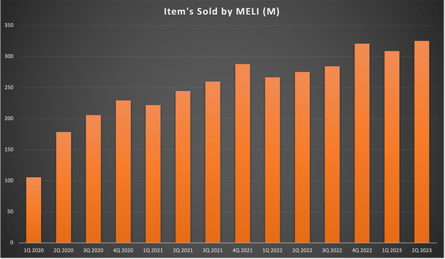 将我们的注意力转向销售商品的数量,我们看到了与 GMV 相似的轨迹。2023 年第二季度,交易量为 3.253 亿件,而上一年为 2.752 亿件,增长 18.2%。
