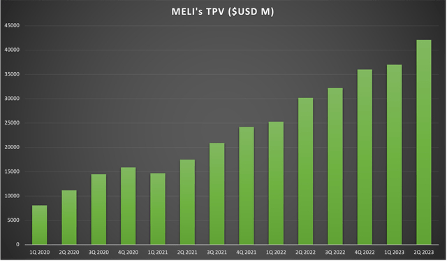 TPV(即总支付量)图表提供了有关MercadoLibre支付平台 Mercado Pago 增长情况的见解。一年内,销量猛增 39.4%,最近的数据表明增长势头有所增强。
