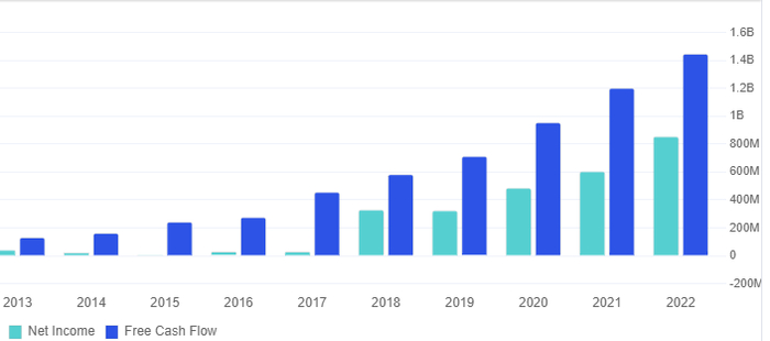 由于其面向服务的性质,Fortinet通常在提供服务之前就向客户收取费用。这导致自由现金流大大高于净利润的情况,因为公司收到的现金流入在实际提供服务之前无法确认为收入。在下图中,您可以观察到,由于这个原因,从历史上看,Fortinet的自由现金流一直超过其净利润。
