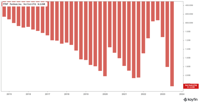 就公司的资产负债表而言,它处于非常有利的地位。该业务产生增长所需的所有现金,这意味着他们很少需要诉诸债务发行。这是一个显着的优势,特别是在我们已经看到的分散市场中。这使得Fortinet未来有可能在不损害公司财务的情况下收购规模较小的公司,甚至增加股东的资本回报。在下图中,我们可以观察到公司的净债务,计算为长期债务总额减去现金和现金等价物。正如你所看到的,这笔债务是负数,而且多年来一直如此。这表明Fortinet持有的现金多于长期债务,显示出非常稳健的财务状况。