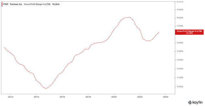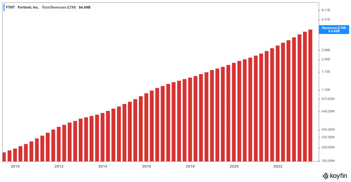 在分析Fortinet的业绩时,首先引人注目的是其令人难以置信的收入增长,从 2010 年的略高于 2 亿美元到目前的近 50 亿美元。这一增长代表着 27% 的复合年增长率。此外,这种增长实际上是一致的,到目前为止,业务中没有明显的周期性模式。