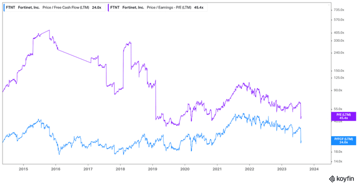 这种情况导致Fortinet的历史市盈率在使用市盈率时经常出现高得离谱的估值。然而,当我们考虑自由现金流倍数时,我们发现估值确实显得更加合理。在进行估值时必须仔细考虑这些细微差别,因为它们可能会严重扭曲现实并导致错误的决策。因此,我们将使用自由现金流作为衡量标准,而不是净利润。