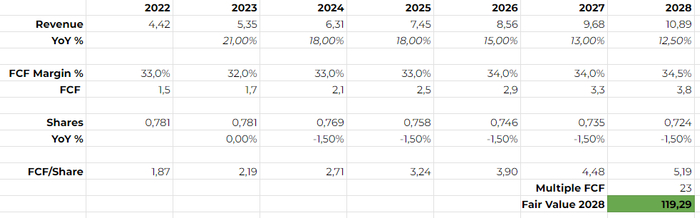 考虑到这一点,我们尝试计算Fortinet股票的内在价值。对于销售增长,我将使用 2023 年的 21%(这是该公司在最近的季度业绩中提供的指导),并根据 Seeking Alpha 分析师的一致估计,在接下来的两年中使用 18%。除此之外,我们将假设随着市场的成熟,销售增长将逐渐减速。