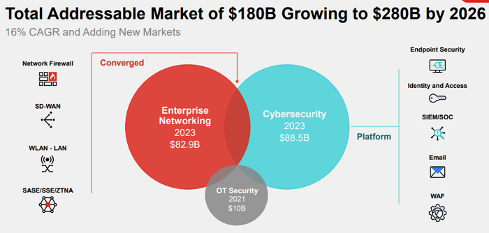 根据Fortinet自己的估计,他们预计 2026 年的总潜在市场将达到 2800 亿美元左右,从 2023 年开始,复合年增长率将达到 16%。最有趣的是,网络安全领域最大的两个领域是一方面是网络,另一方面是网络安全。Fortinet凭借其硬件和软件产品脱颖而出,成为同时满足这两个市场需求的少数几家厂商之一。这种双重聚焦的方法为他们提供了优于较小竞争对手的优势。