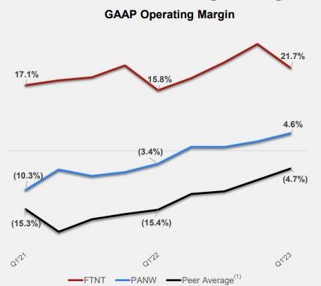 如果我们看看公司的盈利能力,最突出的是其巨大的毛利率。由于该公司向服务业转型,这一利润率一直在扩大。事实证明,这种转变对公司非常有利,微软和亚马逊就证明了这一点。产品领域的毛利率已经达到了61%,令人印象深刻,但更值得注意的是服务领域的毛利率高达85%。公司的总毛利率为75%。只要服务在Fortinet中继续占据主导地位,预计这一利润率将继续扩大。