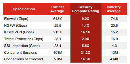 所有这些设备都是由Fortinet自己设计和制造的,这使得该公司实现了垂直整合,并提供了随之而来的所有成本优势。此外,Fortinet的产品在质量、速度和效率方面优于大多数竞争对手。该公司本身将其防火墙的平均性能与领先竞争对手进行了比较。虽然必须谨慎进行此类比较,因为公司经常提供对自己有利的数据,但它仍然很好地表明了Fortinet产品的质量。